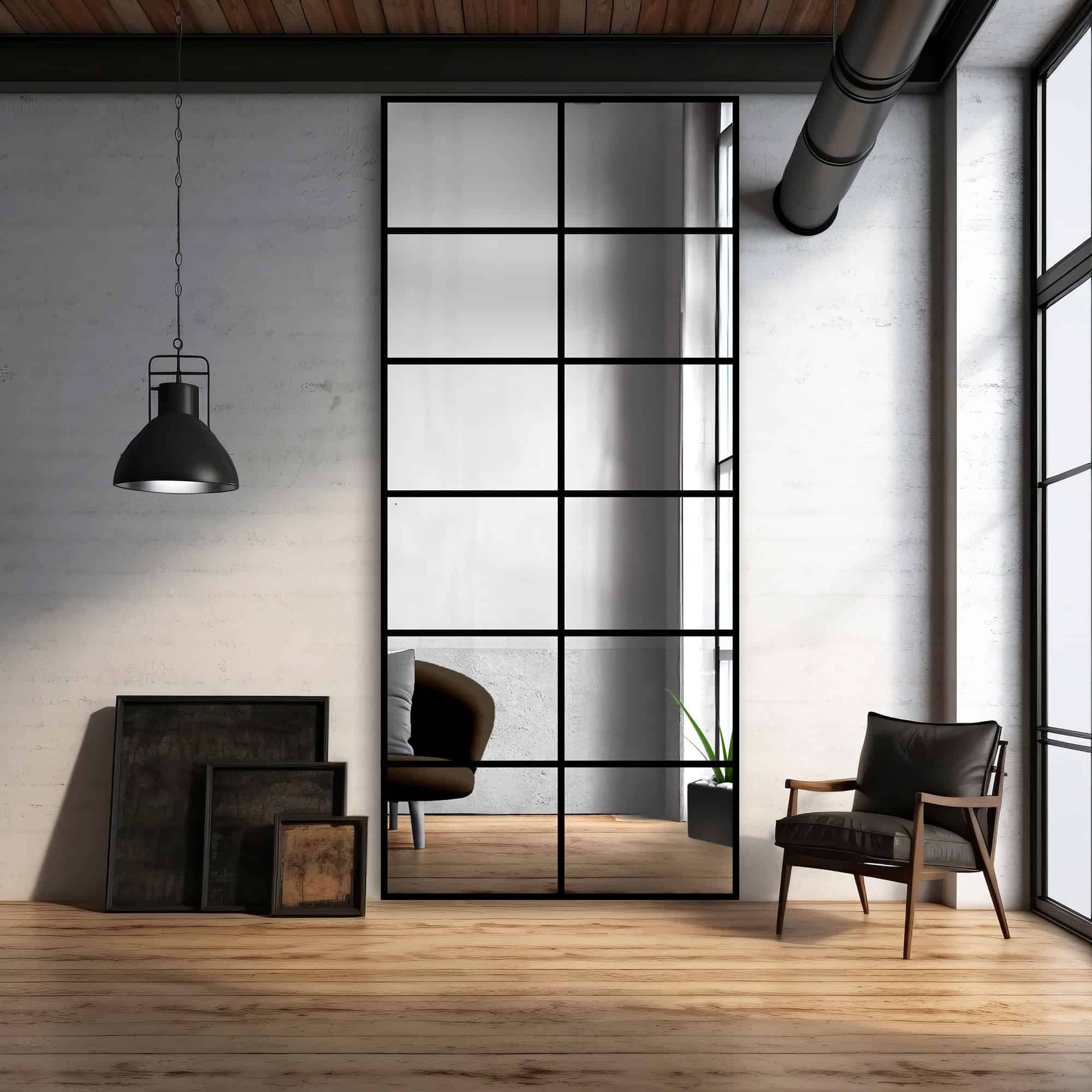 Příčky evokují velká průmyslová okna. Připomínají prosklení s kovovými prvky ve fabrikách. Ideálně by měly být černé – bílé jsou příliš jemné a nepůsobí industriálně. Nejlépe, když bude takové industriální zrcadlo s příčkami co největší. Mělo by být orientované na výšku a může sahat až ke stropu. Opticky tak prostor prodlouží směrem vzhůru a vhodné rozvržení příček to ještě zvýrazní.