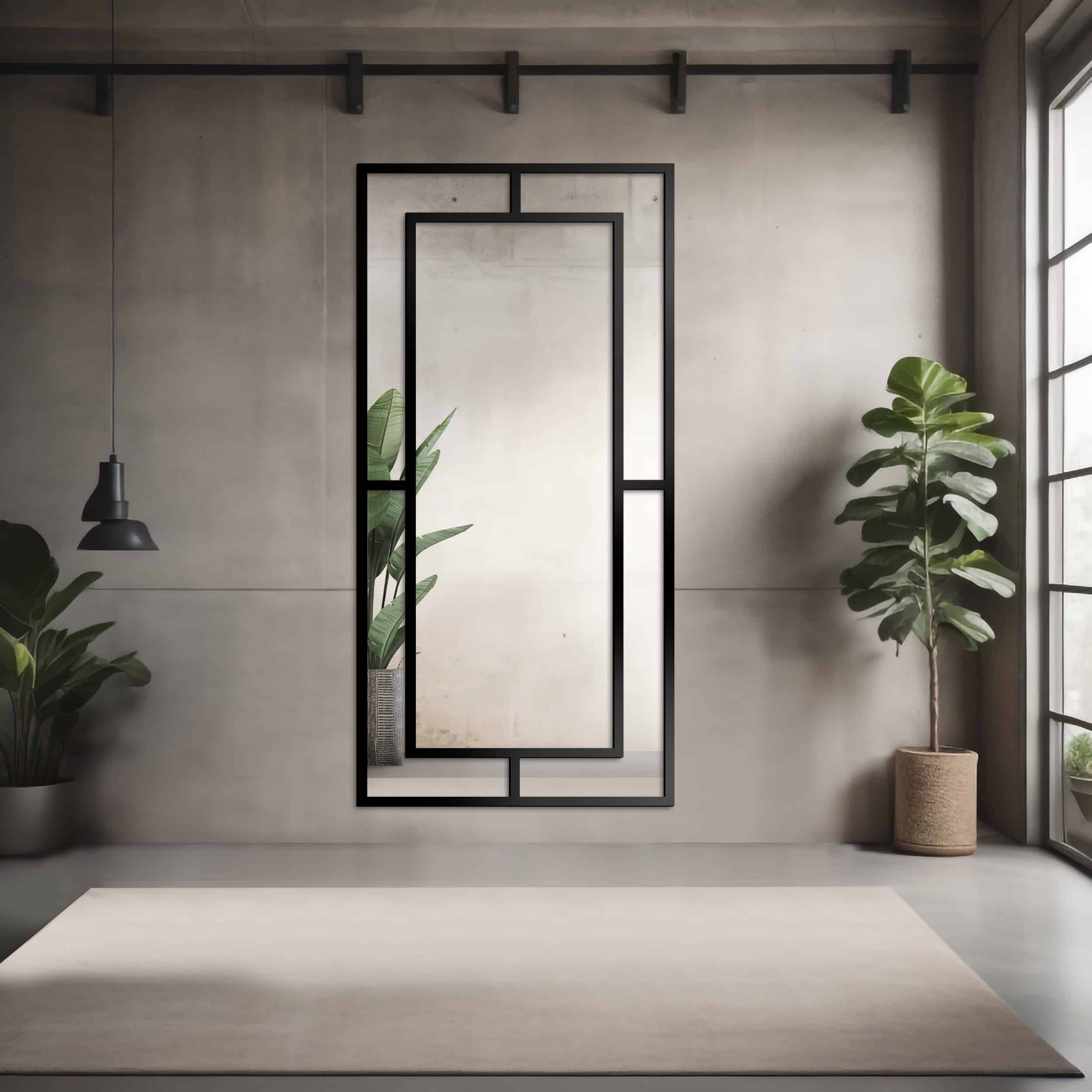 Tyto rámy by měly být jednoduché a co nejvíce střídmé. Nejlépe černé, protože právě tato barva by se měla objevovat v celém interiéru – zejména v doplňcích a jako výrazný akcent. Bílé rámy by byly stejně jako příčky příliš jemné. Také v tomto případě platí, že čím větší a výškově orientované zrcadlo, tím lépe. Pokud interiér neobsahuje příliš výrazné černé prvky, měl by být rám užší. Pokud naopak ano, lze zvolit širší rám.