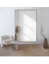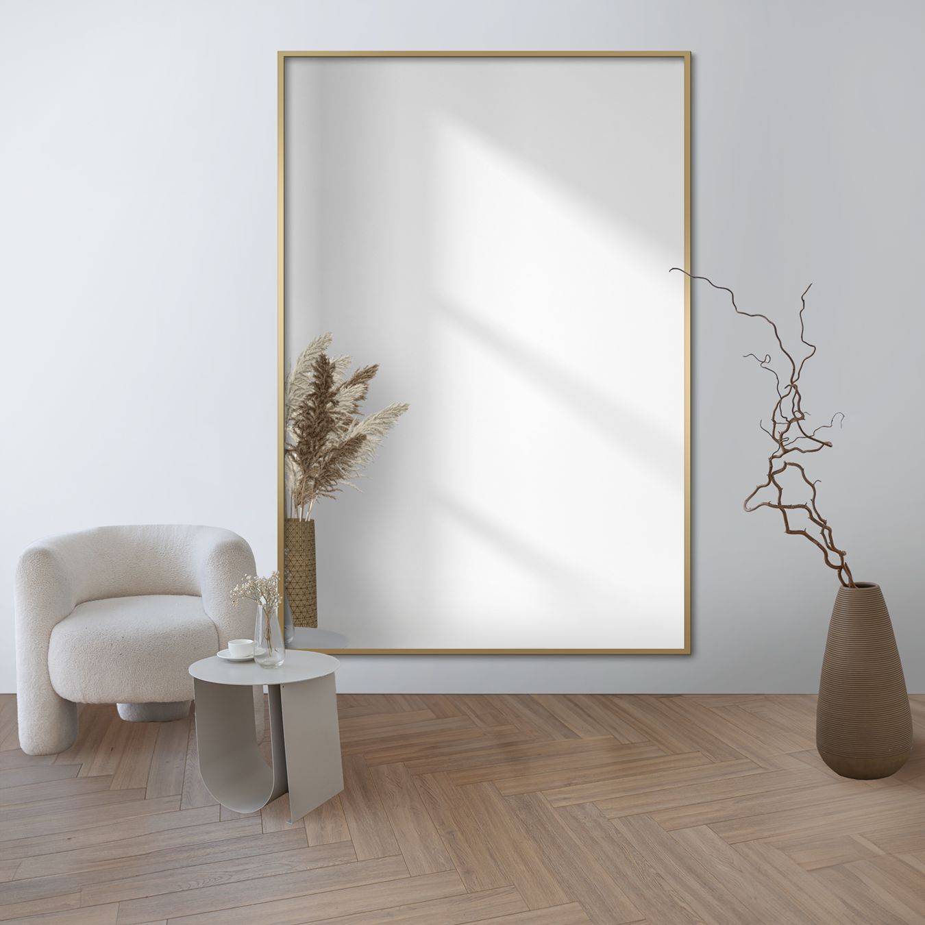 Podobný charakter má interiér s obdélníkovým zrcadlem v minimalistickém rámu 1201 a minimalistickým uspořádáním. Ostatní tvary zase odkazují na plynulé linie a sušené květiny, větve a vázy na přírodu. Další prvek asymetrie představuje dřevěná podlaha s rybinovým vzorem, která zároveň prostor trochu zatepluje. Dominují světlé barvy a zemité odstíny, které jsou prolomeny jednoduchým černým rámem, který jemně kontrastuje s bílou stěnou. To je dobrý základ pro přidání několika drobných doplňků v barvě rámu. Stojí za to dodat, že zrcadla v rámech ladí s wabi sabi, ale rámy by měly být hladké a jednoduché a jejich vzhled co nejpřirozenější. Harmonizují s filozofií přijetí přirozenosti, nedokonalosti a jednoduchosti. Minimalistická forma zrcadla nepůsobí v interiéru tísnivě, odráží okolí, dodává mu hloubku a odráží klidné světlo, což zapadá do ideje tohoto stylu. Minimalistická jsou také zrcadla bez rámu, jako v případě předchozího uspořádání s modelem ANTIK. Stejně jako všechna zrcadla, která nemají zbytečné prvky a ozdoby, což zapadá do snahy o jednoduchost.