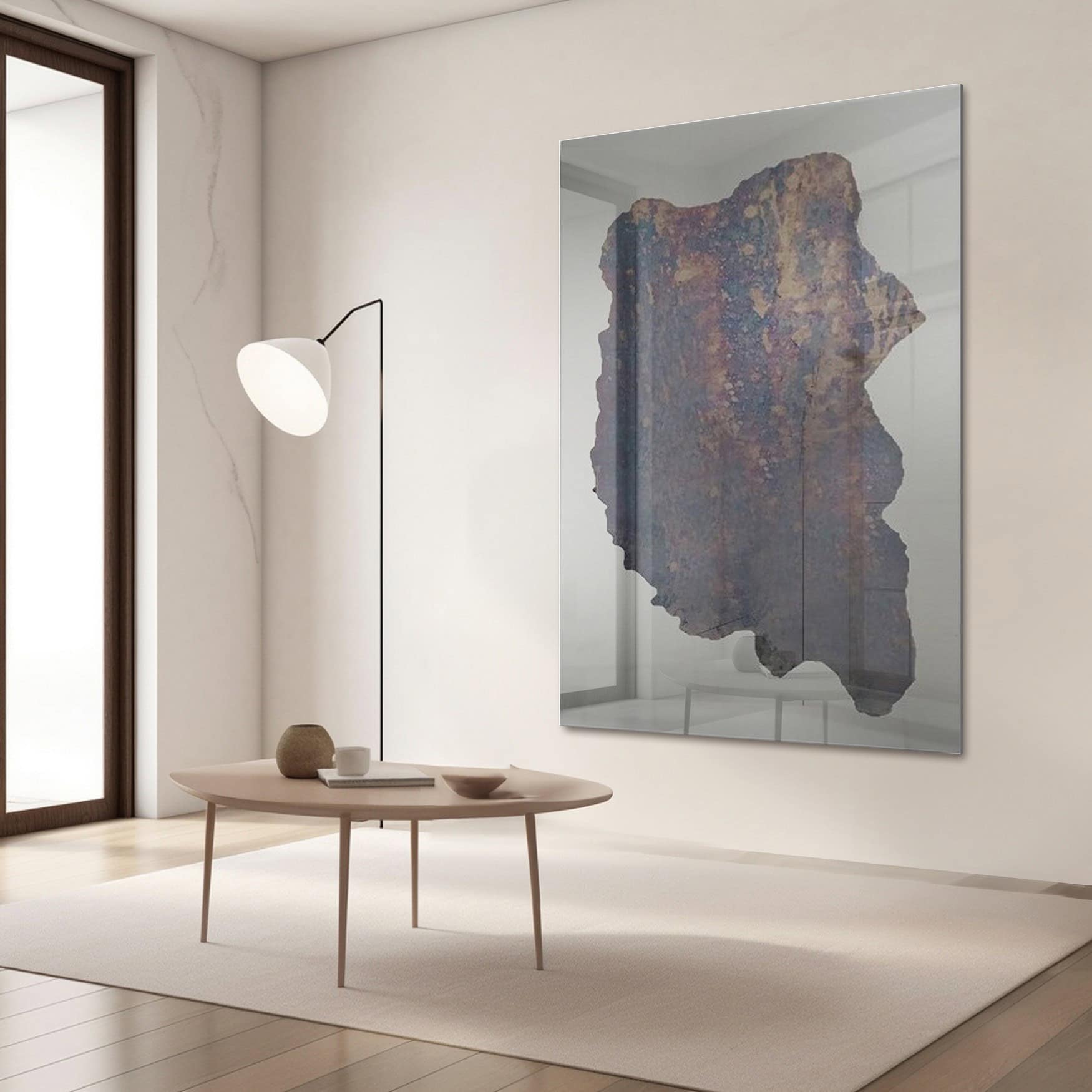 Zmíněná zrcadla se velmi dobře hodí ke stylu wabi sabi, který si cení krásy nedokonalostí a stop času, odkazujících na jeho plynutí, které je zde důležité. Nejde přitom o staromódní rámy, ale o skla, která vytvářejí efekt starého prvku. Zestárlá povrch zrcadla s barevnými skvrnami a nerovnostmi odráží přijetí pomíjivosti a přirozeného opotřebení, což je klíčovým prvkem této filozofie. Navíc takové desky nejsou dokonalé, takže se skvěle hodí k zdůraznění nedokonalostí. Takové je dekorativní zrcadlo se zestárlou, nepravidelnou deskou ANTIK, kde již samotný název odkazuje na něco antického. Boční části jsou z bílého skla, patina má nepravidelný tvar, připomínající trochu mapu, což ještě více odkazuje na přírodu. Jeho barvy se pohybují kolem staré rzi a tmavších zemitých odstínů, což představuje poměrně silný a výrazný barevný akcent. Ačkoli je zrcadlo zavěšeno symetricky vzhledem k koberci, stárnutí zde představuje prvek asymetrie a je ústředním bodem stěny. Samotný interiér je jednoduchý, minimalistický, plný vzduchu a přirozeného světla.