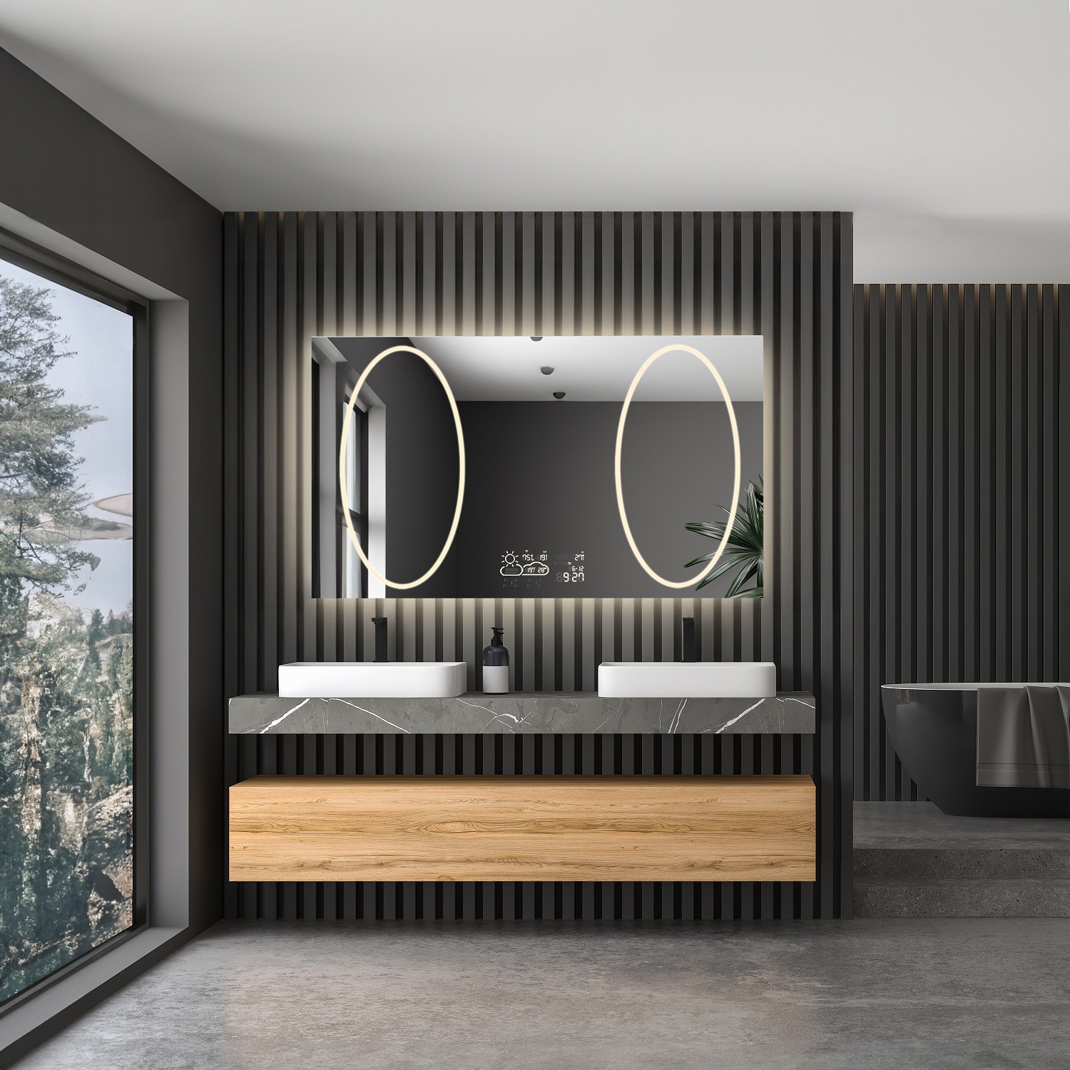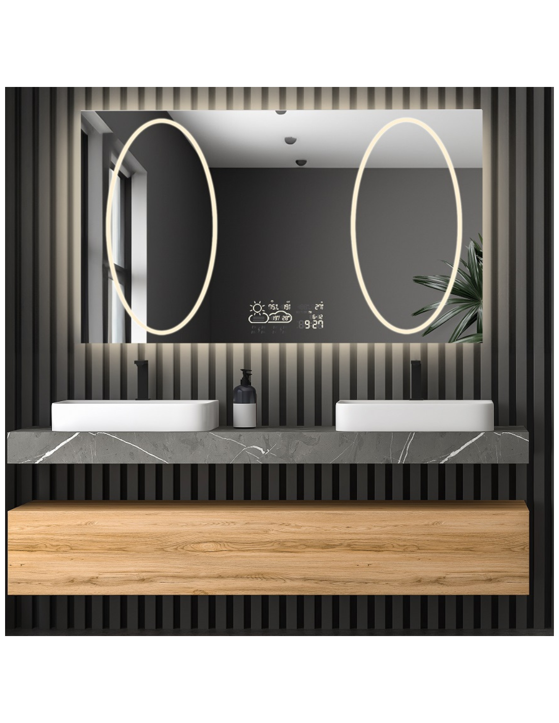 Meteorologická stanice s Wi-Fi - Jedná se o chytrý modul, který umožňuje sledovat povětrnostní podmínky jak uvnitř, tak i venku. Meteorologická stanice s Wi-Fi je podsvícena nezávisle na osvětlení zrcadla, což umožňuje číst data za všech podmínek, stejně jako v noci s funkcí "noční režim". Navíc stanice má funkci zobrazení aktuálního data, času a Wi-Fi 2,4 GHz. Stanice vyžaduje další trvalé napájení. Velikost LED displeje na zrcadle: 7 cm x 17 cm. Modul lze nastavit pomocí dedikované aplikace pro zařízení s iOS nebo Androidem, což umožňuje přizpůsobit všechna nastavení dle svých potřeb.